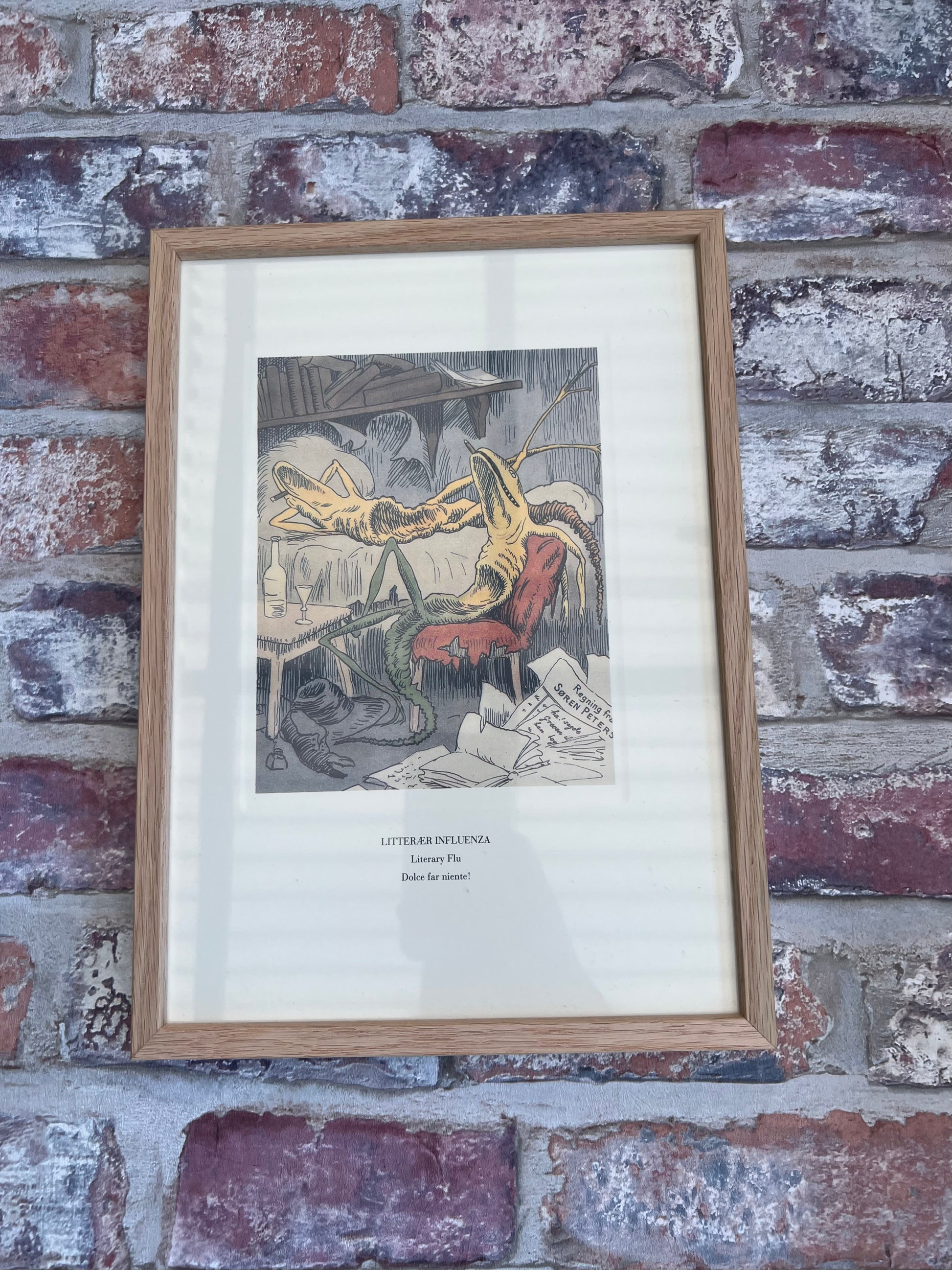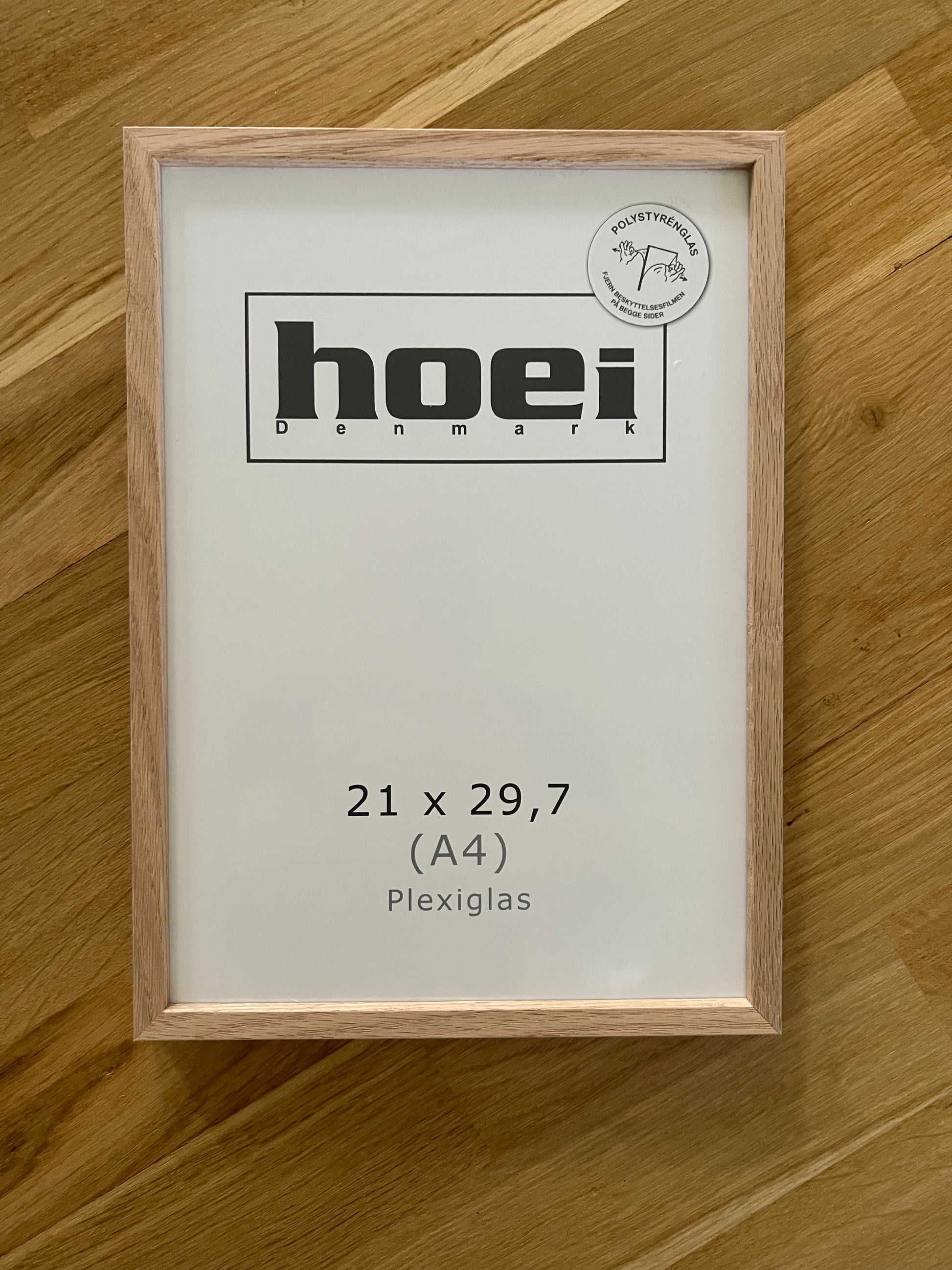 Planchen er indrammet i en massiv egetræsramme med plexiglas fra Hoei Denmark.