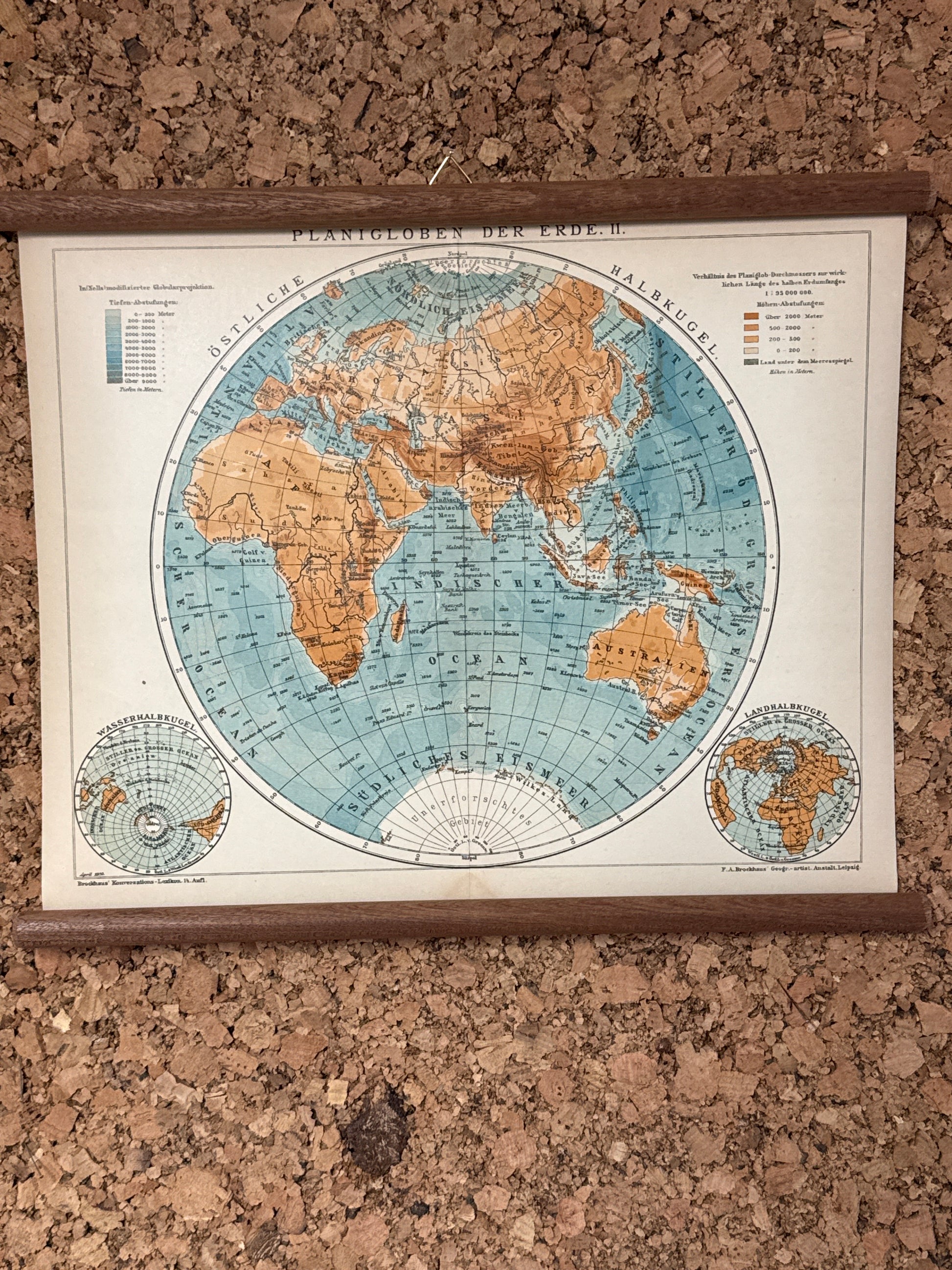 Ældre planche nænsomt frigjort fra sin oprindelige plads i leksikon, dobbeltforstærket med lærredsstof og monteret på nye mahognirundstokke.